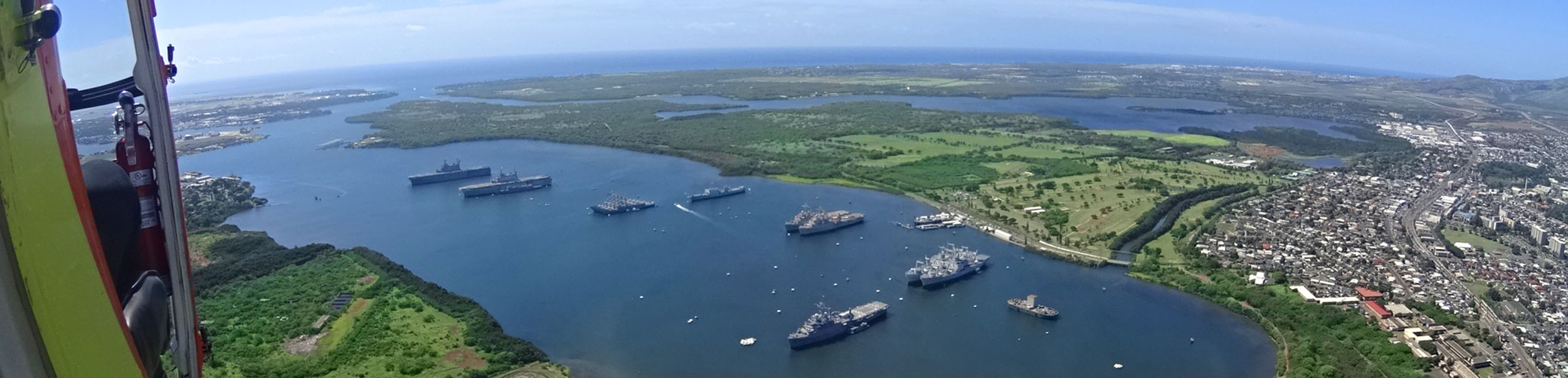 We fly south over vast pineapple and farming plantations. In the distance the rims of ancient volcanoes jag upwards. Within minutes we can see the south coast and Pearl Harbor’s collection of battleships. From our high vantage point directly overhead it looks like a young boy’s bedroom, an enviable collection of toy ships waiting for playtime. TC circles the USS Arizona, sunk by the Japanese on 7 December 1941 leading the USA into World War II. The silhouette of her hull is still visible through the clear Pacific waters.