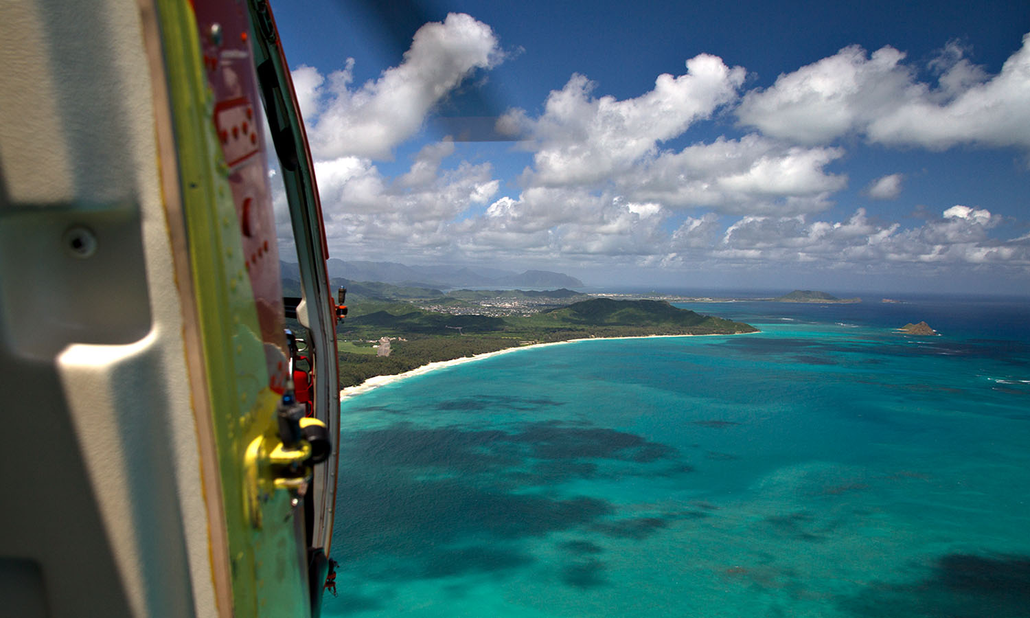 Our pilot, whom I call TC (he tells me he’s heard it before), points out the famed surf breaks of Sunset Beach, Waimea Bay and the treacherous Pipeline. From this height they don’t seem so nasty. TC banks sharply inland and, as the helicopter leans, I’m looking directly down at the coast. It isn’t the first time in this hour-long circumference of Hawaii’s O’ahu that I question asking for the “no doors” option.