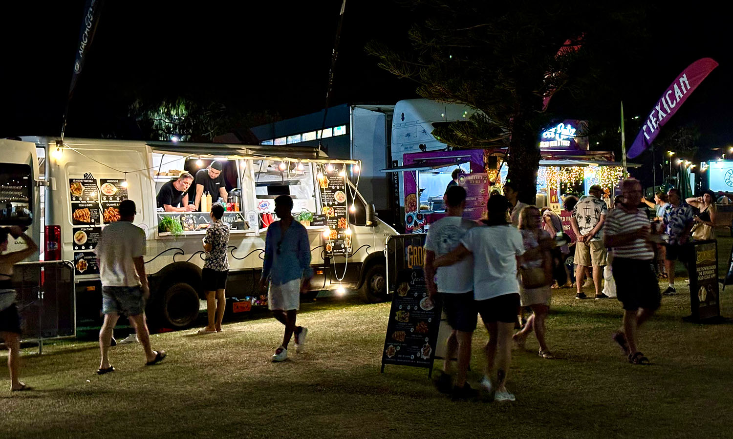 I started at the main precinct in Kurrawa Park when the sun went down, where the smell of barbecue smoke drifted through the air. Market stalls lined the grassy edges, selling everything from hand-tooled leather belts to sequined cowboy hats, pearl snap shirts, and boots so sharp they could cut glass. There was even a stand offering custom belt buckles that could double as small dinner plates. Nearby, the food trucks were going hard — slow-cooked birria tacos, cheesy quesadillas, crispy fish & chips, churros, and (because this is the Gold Coast) a stall selling ceviche for anyone pretending to be healthy between beers.