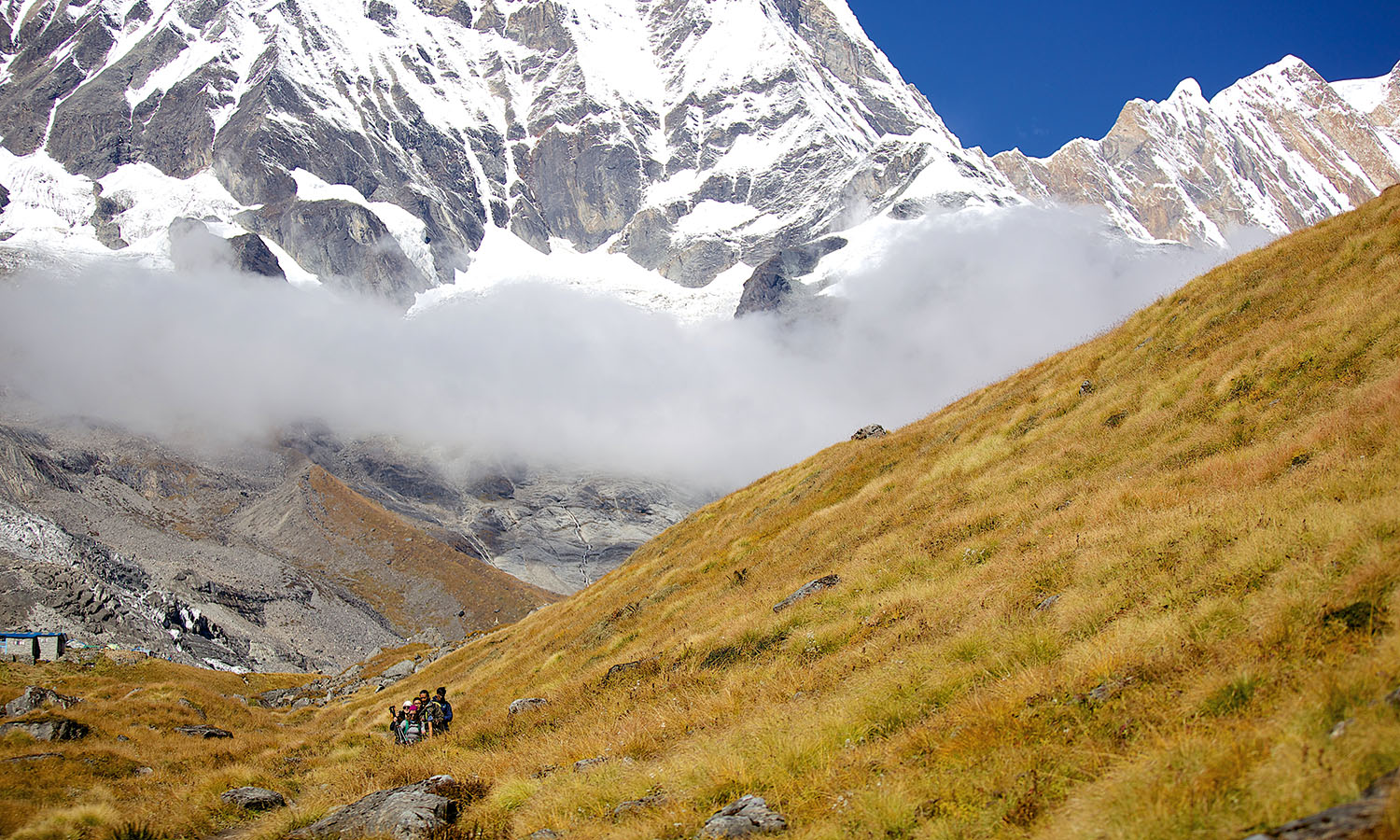 We break for lunch at Machapuchare Base Camp – the final pit stop before we reach our destination. The sacred Fish Tail is unconquered and off-limits to climbers, who fear being struck down by Lord Shiva, who is said to reside on the summit, or so the legend goes. However, its virgin status has been questioned over the years. The only known attempt was in 1957 by British trekkers Wilfred Noyce and A.D.M Cox, who turned back just 150 metres from the summit at the behest of the King of Nepal himself.