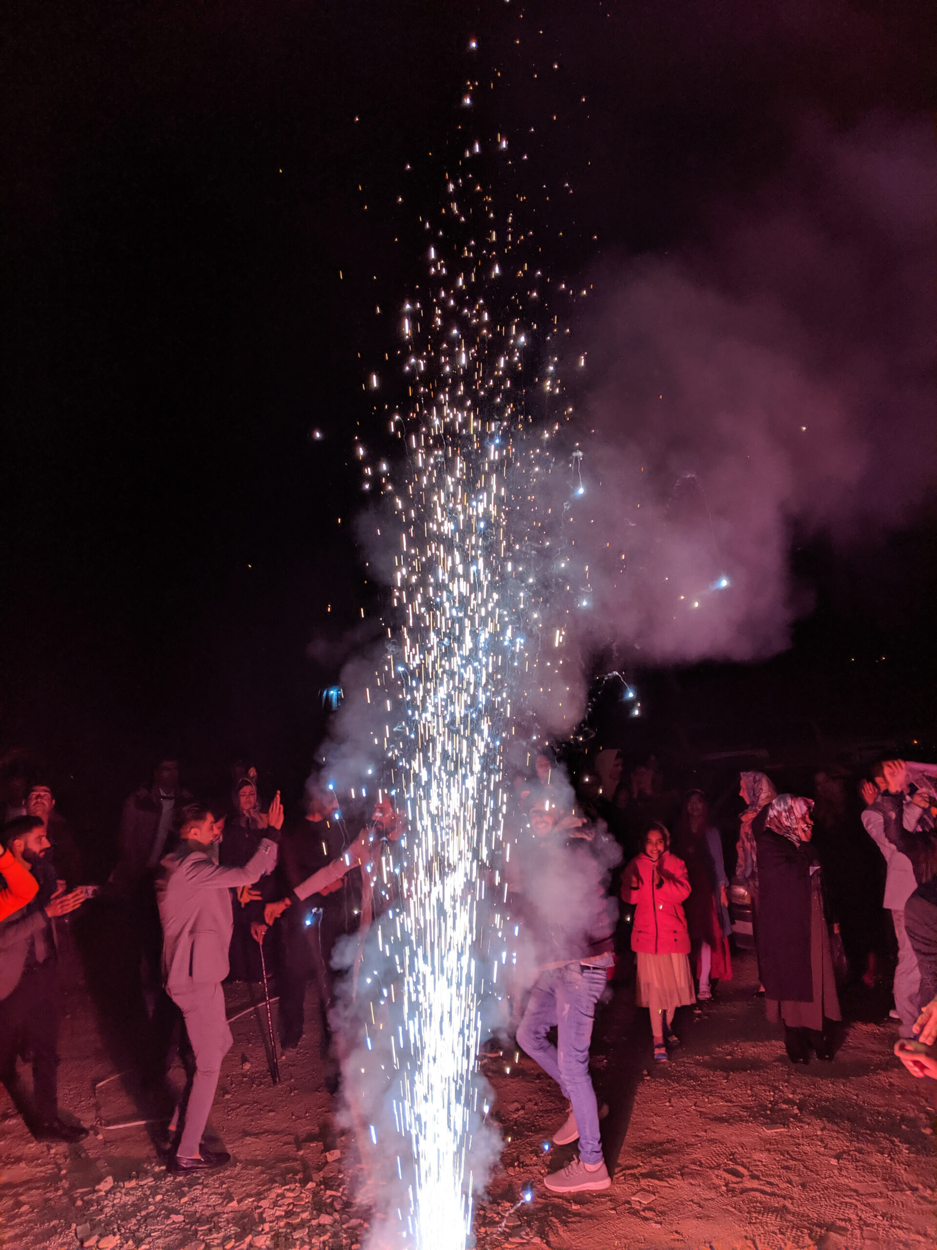 Based on a family’s level of conservatism, weddings here are generally (after a brief but extravagant ceremony) split into two parties based on gender. We’d watched at the start of the night as the bride and groom walked down a makeshift aisle to fireworks and flares, before dramatically releasing two white doves into the night sky. Shortly after we said goodbye to the girls, who disappeared into a separate hall to us.