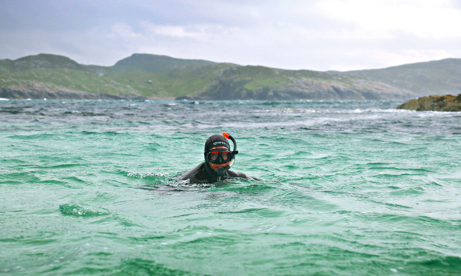 It’s here we meet Daryll to explore the first site on the snorkel trail. It’s cold, so we pull on six-millimetre wetsuits and hoods to guard against water that’s around 12ºC. In the summer months, Daryll assures me, the ocean around Harris can be bathwater warm, but it’s far from that today – the cold knocks the air from my lungs when I first sink into it. A few minutes later, my body begins to adjust and I enjoy the refreshing swim around the bay. Golden kelp forests and what look like giant ponytails, but are in fact bootlace seaweed, dance below us in the ocean. Huge crabs sidestep along the sand. “It’s a magical landscape,” says Daryll when we surface.
