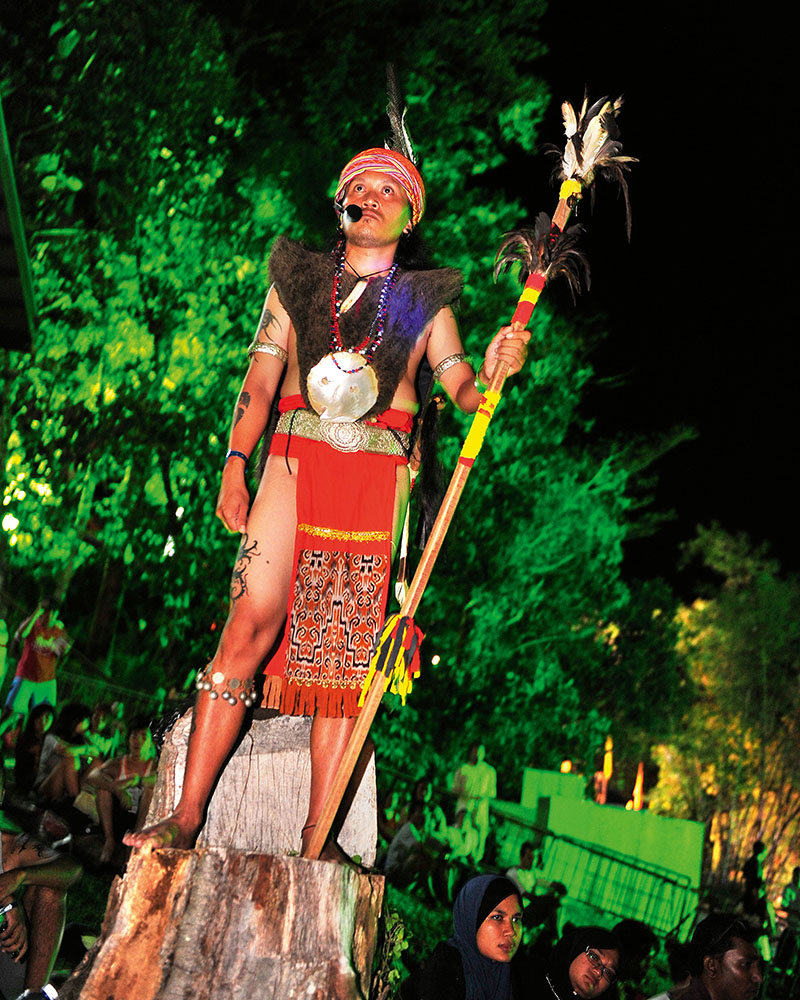 A tattooed Iban warrior, with an embroidered loincloth and brown animal-hide fur vest, stands on a tree stump, divining rod in his left hand, raising a spear to the sky with his right. He’s directly behind me on a small slope in the Sarawak Cultural Village. It’s 11 o’clock at night and most eyes here at the Rainforest World Music Festival (RWMF) are not on the warrior but rather on the main stage, as their hips shake and bodies bounce to the balafon melodies and djembe beats of Burkina Faso’s Mamadou Diabate.