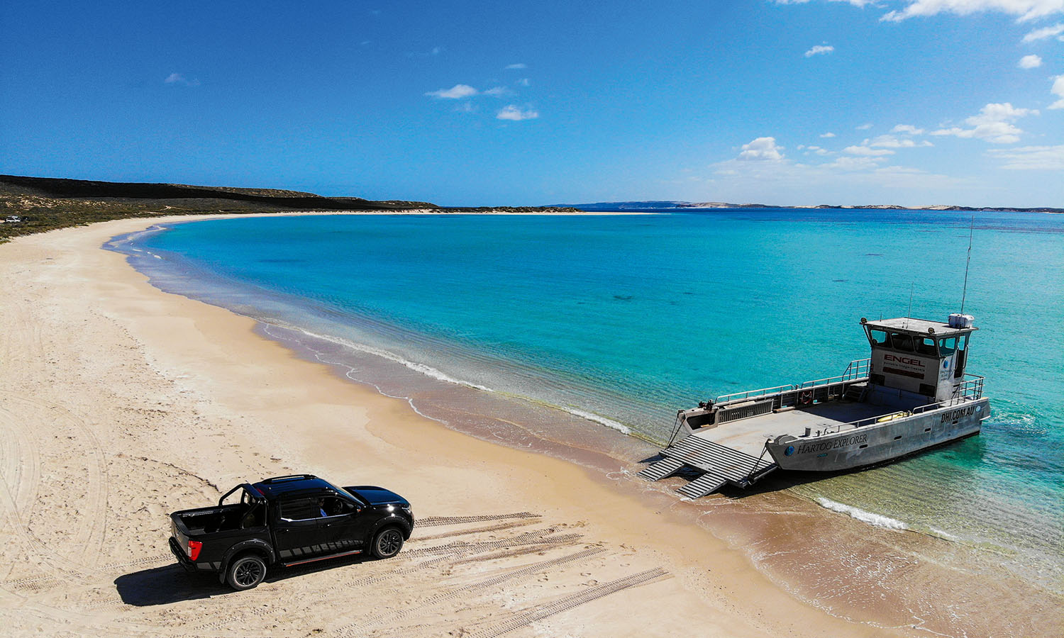 As the sun rises behind us and we both look back at Steep Point, mainland Australia’s most westerly outcrop, it’s time to get down to business. Despite the early hour, the Dirk Hartog Explorer, a makeshift barge specifically designed to transport a single 4WD and camper trailer from the beach, approaches the shoreline and we drive carefully onto the deck.