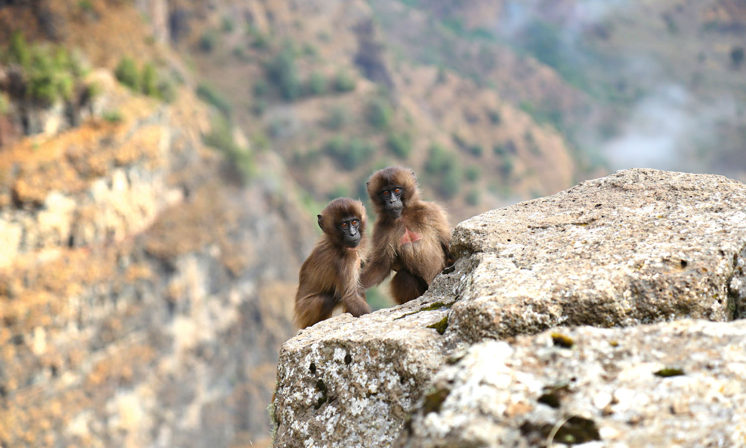 It’s not just geladas here, though. As we hike out to a ledge, we spot a bushbuck among the trees and small klipspringers on the cliffs below. Dawit and Dani list the exotic names for the impressive procession of birds of prey that soar across the canyon: griffon vulture, augur buzzard, Verreaux’s eagle.
