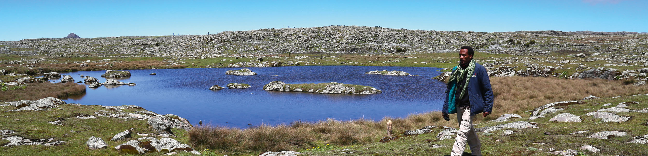 On the road to the Sanetti Plateau, we pass by colourfully painted mosques and through several small villages within the national park. Clouds rise up from the valleys and onto the peaks, creating enough moisture to explain why the 4000-metre-high ground of the plateau is so green and fertile – there are more than enough small lakes, rivers and plant life to make this area an attractive home for the wildlife.