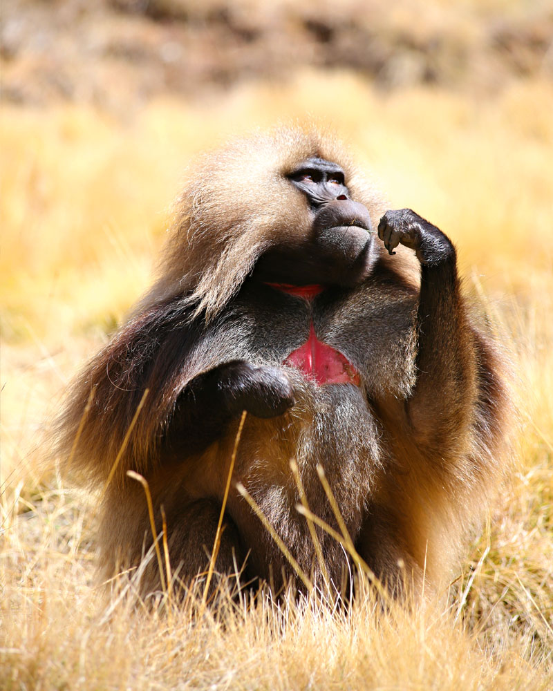 I’m being given the cold shoulder. It’s my fault; all the gelada monkey wants to do is dig into the ground for fresh, juicy grass and eat in peace, but from a few metres away, I’m pointing a camera lens in his face. His reaction is still surprisingly human, and a little at odds with the rest of the primates’ behaviour. Minutes before, I’d seen adults having rambunctious sex, not caring at all that they were surrounded by friends and family, including their offspring and the male’s other ‘wives’. When it comes to eating, though, it seems they prefer a little privacy.
