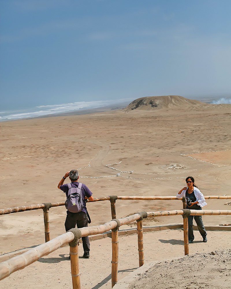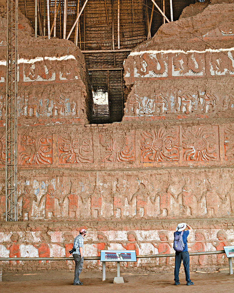 If you’ve a curious mind there is much to marvel at with the still-unfolding story of the Moche civilisation. If not, there’s enough sex, death, war, nudity and drug use to hold your attention. In Lima’s Museo Larco the pottery engravings are so sexually explicit and enliveningly graphic they are kept in an adults-only gallery. Depictions of highly ritualised human sacrifice involving gruesome torture and the imbibing of a hallucinogenic cactus to appease a god known as the Decapitator are a frequently occurring motif. Immensely impressed with these details, I find the Moche culture comes to life. I begin to think there might even be the bones of a HBO series buried out there in the desert somewhere.