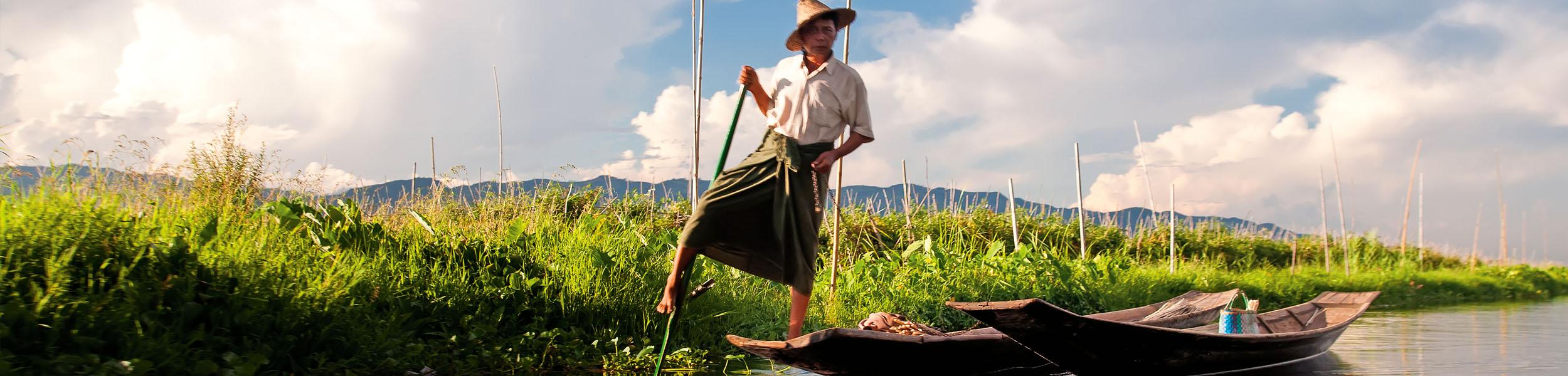 Out of the mist, with the first rays of dawn pouring over the eastern hills, a fisherman appears. He’s trawling across what appears to be a thin sheet of glass, one strong leg propelling his slender canoe while he hefts a massive cone-shaped net above his head. The Intha fishermen, members of the Tibeto-Burman ethnic minority group that make their homes in stilt houses on the lake, are self-sufficient fisherfolk and farmers known for their unique one-legged rowing style. With the sun up, Inle’s water world slowly reveals itself, from pagoda-spiked coves to the green islands of vegetation that float atop the water.