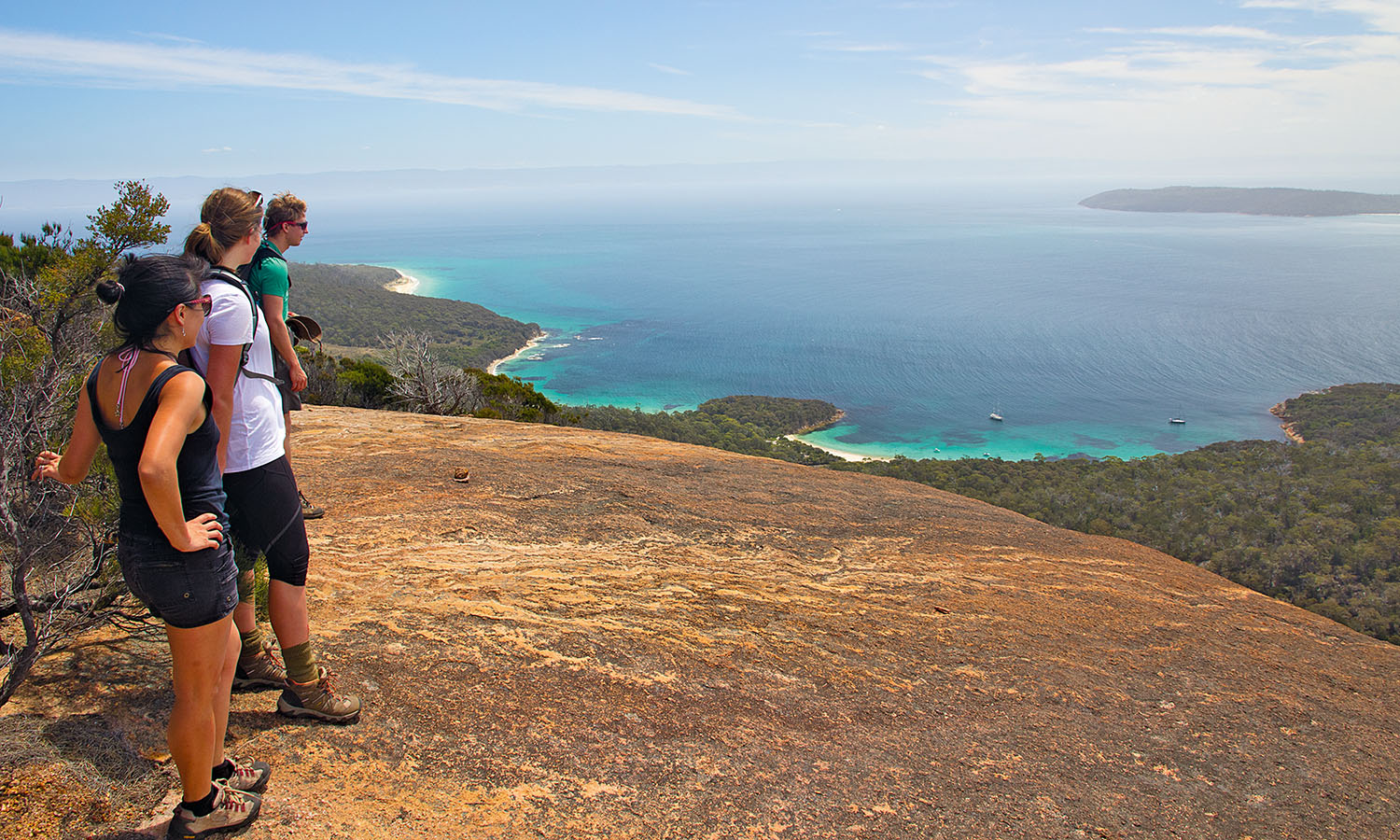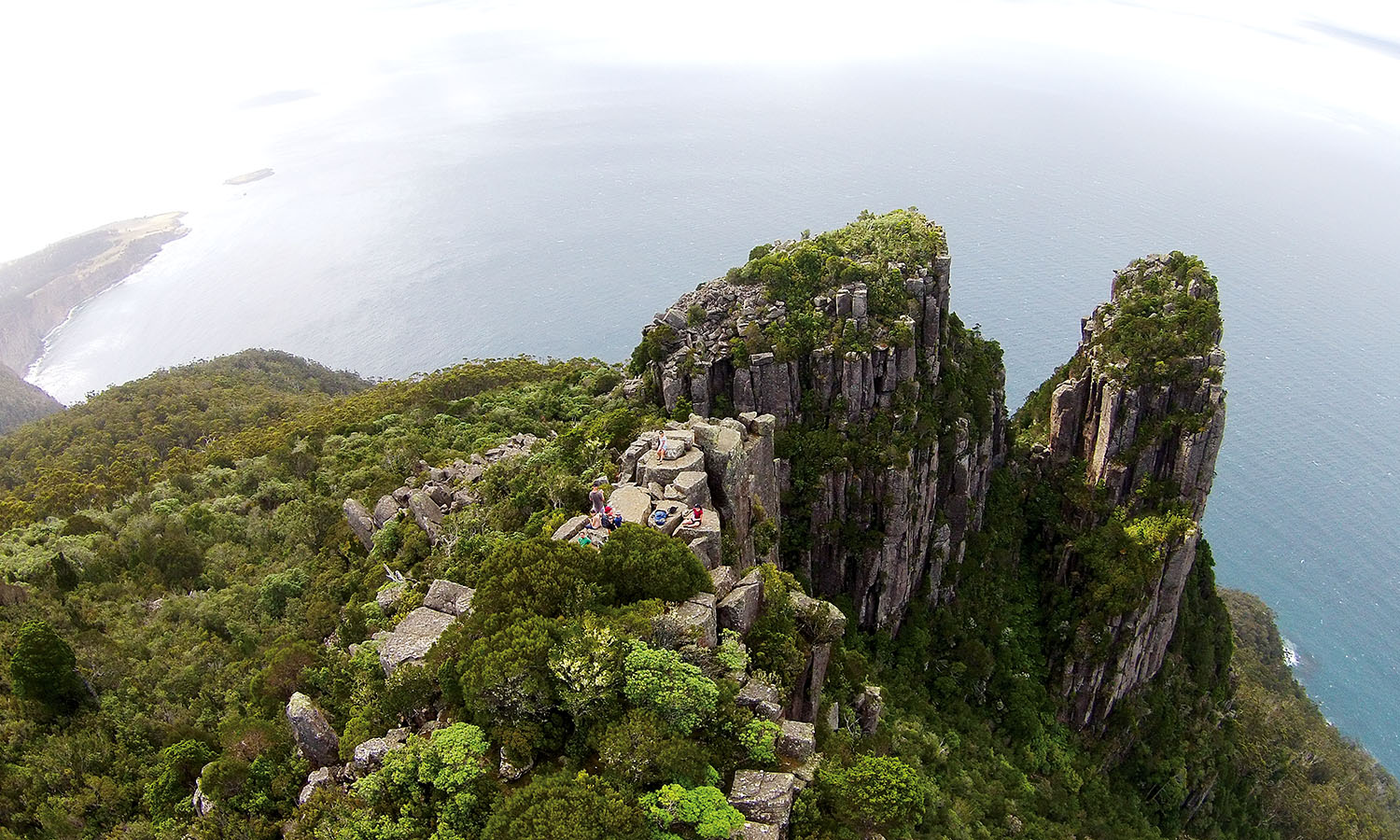The walk begins at a leisurely pace along the coastline, slowly gaining in difficulty as we near the peak. The odd wombat watches us wander by as the terrain changes from open grass to thick bush to craggy vertical climbs. Finally we reach a cluster of boulders that provides the perfect platform to look back down from where we came. There is a sheer 600-metre drop on one side with the peaks of Bishop and Clerk framing the slowly setting sun. In the distance the Lady Eugenie is now just a speck and the sense of accomplishment is incredible. For the first time I think I understand what hikers are on about.