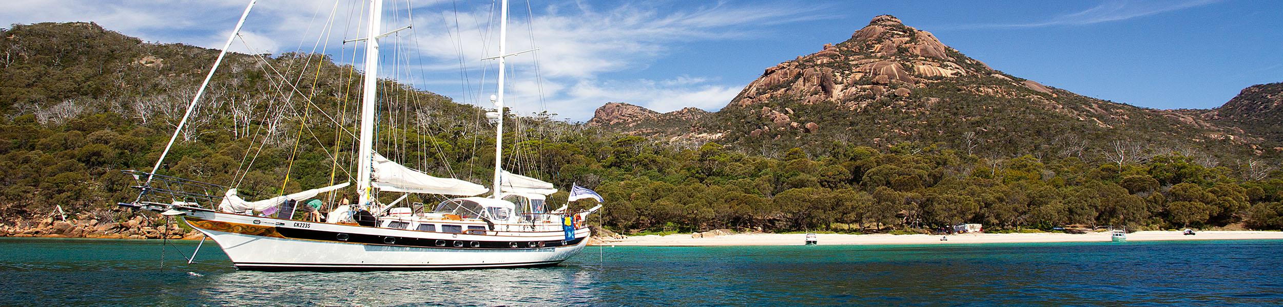It is only a couple of hours from Mount Graham down to the beach, and our shoes are off and our aching bare feet in the chilly water before you can say “fill my wineglass”. I can see the Lady Eugenie anchored on her own, perfectly positioned out in the bay. A bunch of other hikers, their tents already pitched behind the dunes, relax on the sand, content, like us, with their day’s adventure. One of them sits beside me and opens a can of tuna. “What a great day,” he says to me. “I’ve earned this!” I smile back, not only to be polite, but also because I can see Captain Chris motoring in from Lady Eugenie and I know what awaits us back on board. “You’re right,” I say to my new friend. “It’s just perfect.”