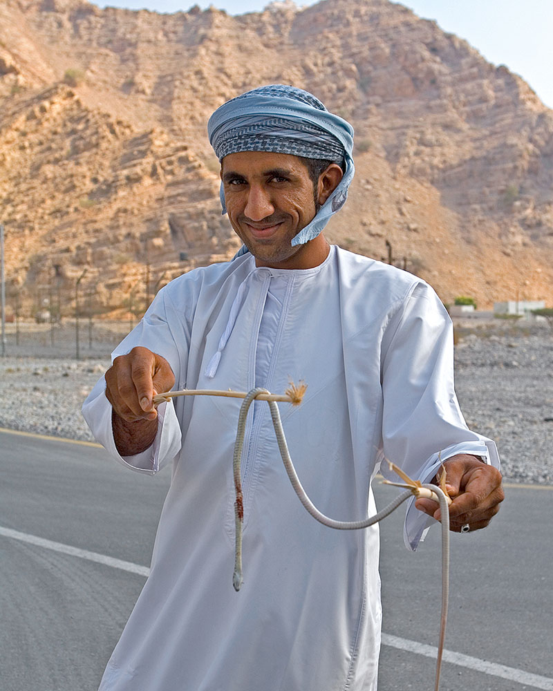 Abdul Karim arranges a brief tour on the school bus of the wadi. We stop to collect a hitchhiking desalination plant worker, and again to ogle a venomous snake slain by a villager with whom it had the misfortune of crossing paths. We then head back to the port to reboard our dhow.