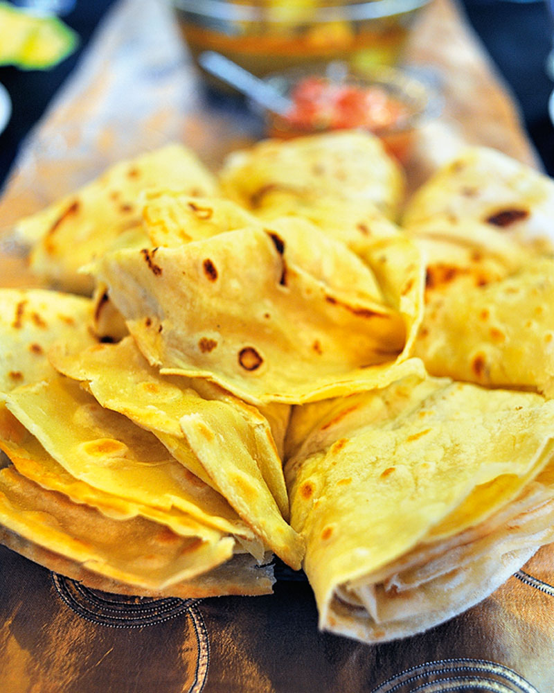 a large bowl. Add oil to mixture and rub it in with fingertips until crumbs form. Add water gradually and combine to create soft, elastic dough. Cover and leave in a warm place for three minutes. Take enough dough to form a tennis ball–sized shape and roll out on a floured surface to form a dinner plate–sized disc. Spread butter on the dough. Roll up the disc to form a cigar shape, hold at either end, then gently swing like a skipping rope until it doubles in length. Place the dough ‘rope’ back on the bench and roll each end inward to form two spiral ‘snail’ shapes. Place one on top of other, covering with tea towel for 30 minutes. Roll out each one to plate-sized flat discs. Fry in hot oil until golden brown on both sides for about two minutes. Once cool enough to hold, clap roti between hands. Serve warm with a curry.