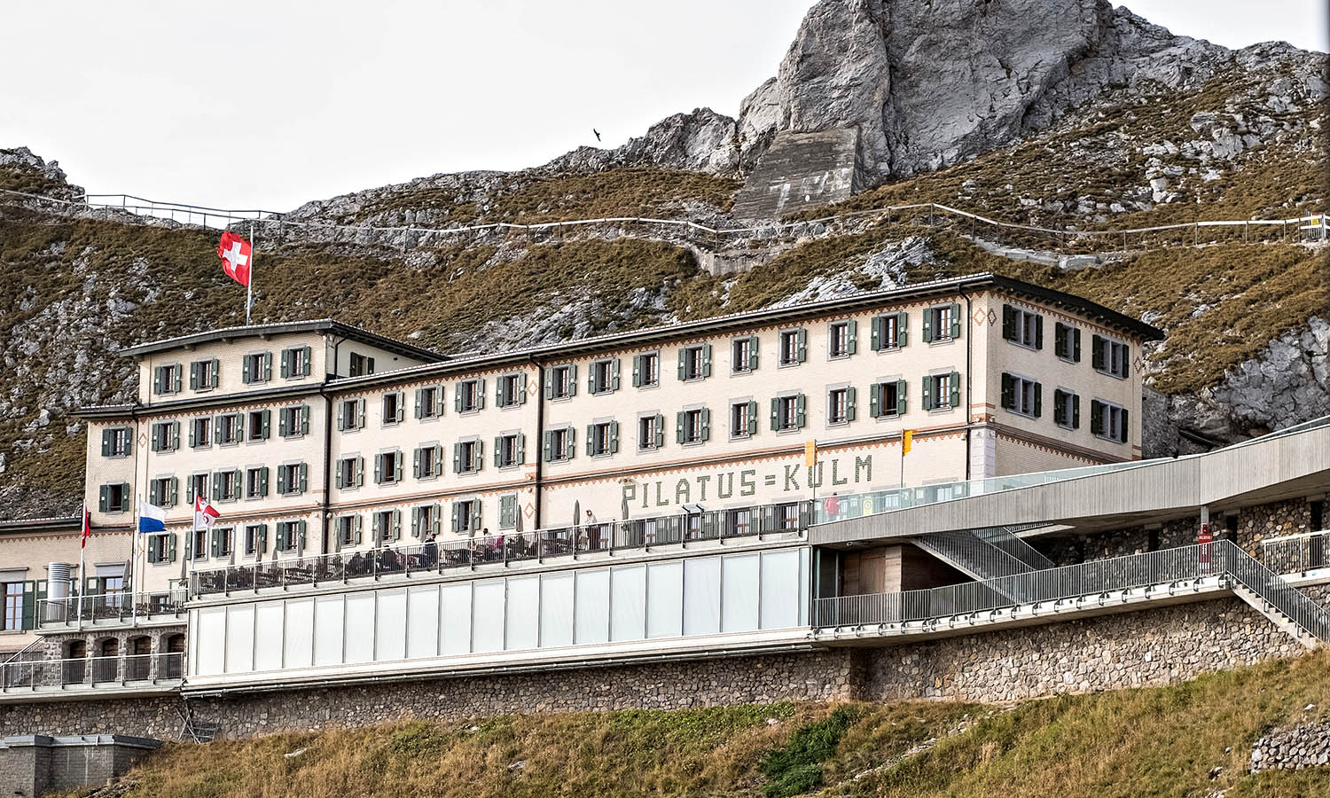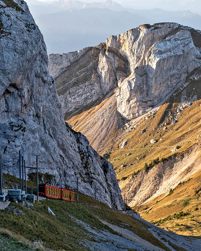 The world’s steepest cogwheel railway is, as you might expect, really freaking steep. I try not to think too hard about the Swiss engineering required to drag this giant red caterpillar car up a giant alpine mountain. But the panoramic views are out-of-this-world, and the hotel—Pilatus Kulm—is straight out of a Wes Anderson movie.