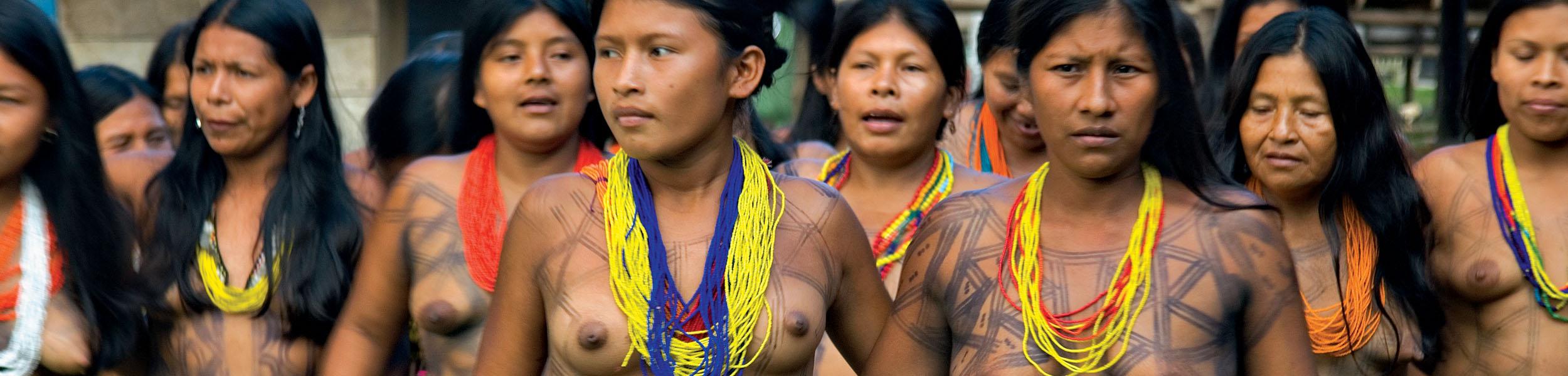 The jungle tribes of the Darien also paint their babies blue when they are about three weeks old. The blue stain of the jagua plant lasts a few weeks and is said to protect the baby from spirits and curses. It probably also provides some protection against insect bites. Throughout their lives the people of the Embera and Wounaan tribes also use this jagua body-paint on ceremonial occasions, and girls are entirely painted at puberty and before marriage. These rainforest tribes are culturally far removed from the Kuna of San Blas. While Wounaan women traditionally wear just a short sarong and traditionally go topless, the Kuna women dress in fantastically bright costumes. Their fine hand-embroidered mola blouses contrast brilliantly with their headscarfs and bead-covered legs. The Kuna people are relatively wealthy and even today the women are frequently decked out in the gold jewellery (and with the typical gold nose ring) that inspired the legend of El Dorado.