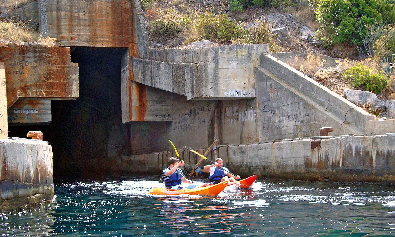 From the water, both sides of the bay look mild and innocuous. Until we spot gaping black holes cut into the cliffs, that is. Tito’s submarine pens are a sobering sight. The formidable President of the Socialist Federal Republic of Yugoslavia had tunnels chiselled out of the coastal rock face as a precaution against attack.