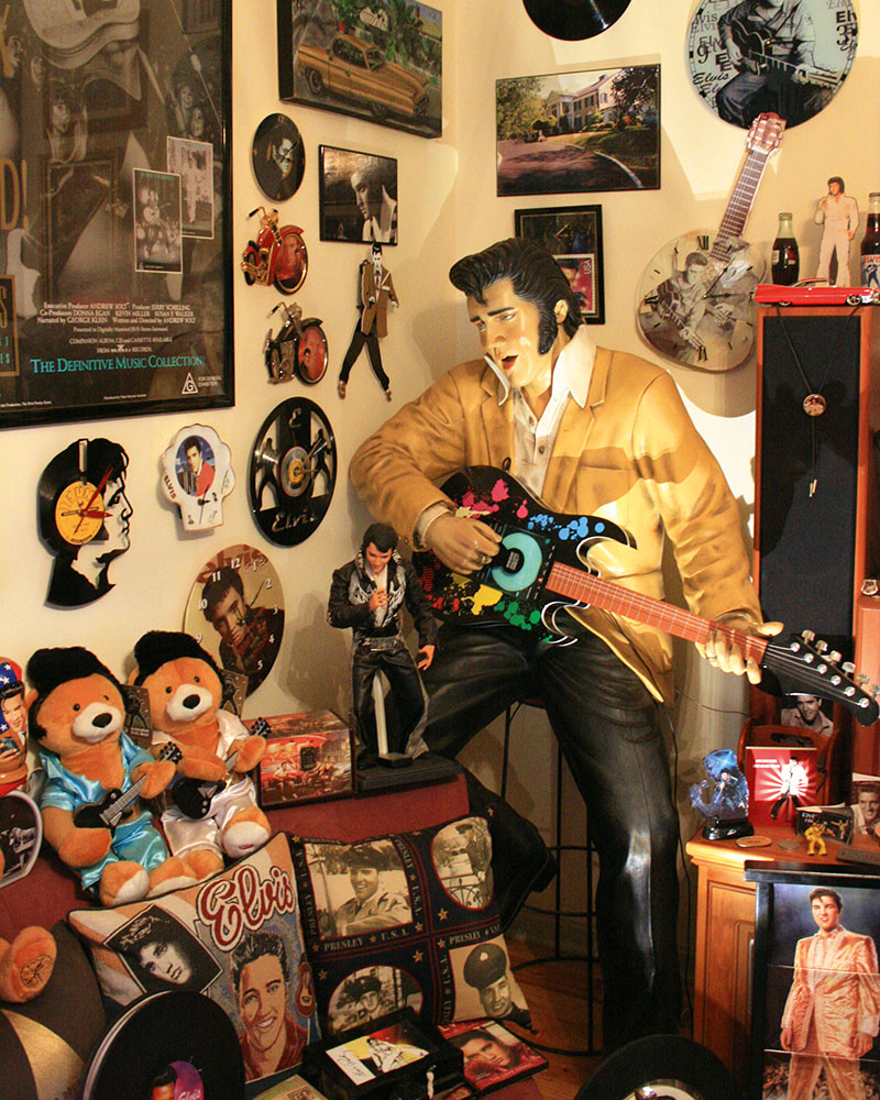 Peter Bleeze lives on the outskirts of Whyalla and he’s not just a fan of the King, he’s a super fan. His entire house is emblazoned with memorabilia, from rare posters to life-size statues. “A young police cadet lived down the street and used to babysit me,” Peter tells me in his front room, where Aloha from Hawaii plays on the television. “He had a little record player and used to play me Elvis records. I thought he was god’s gift to singing.
