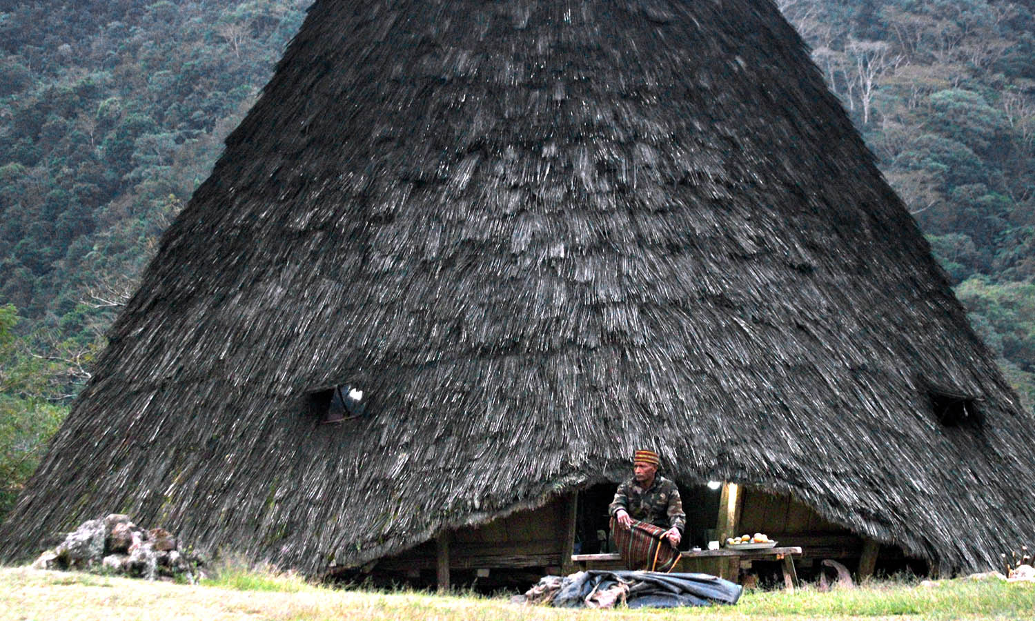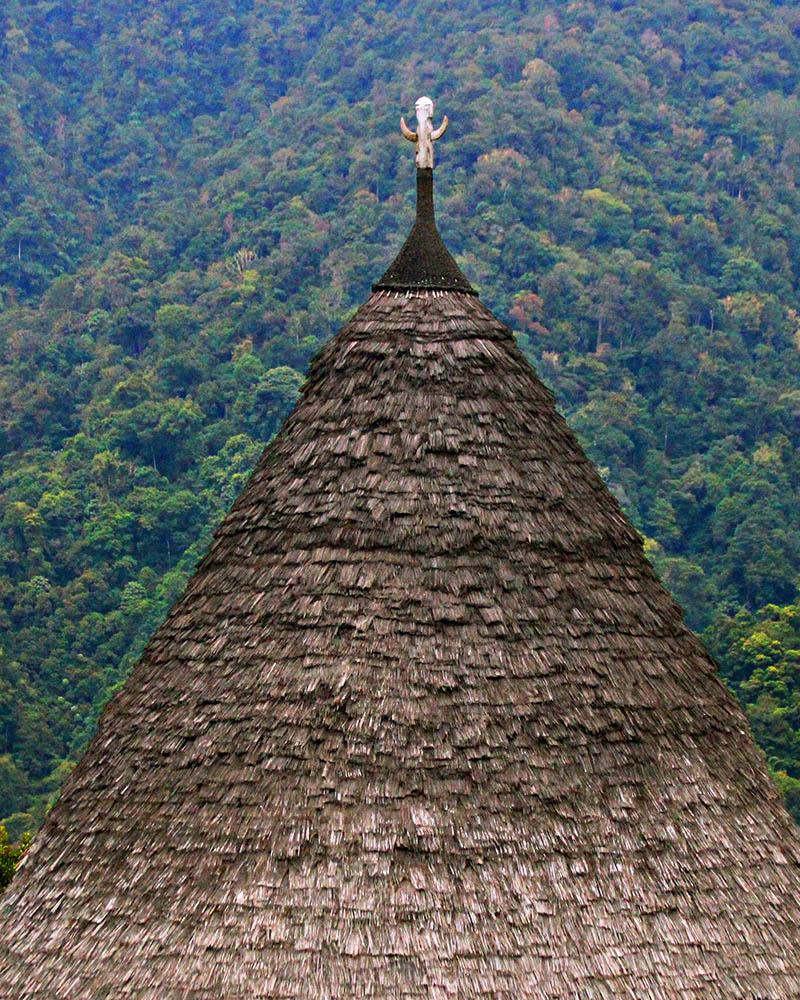 The Mbaru Niang are wooden, cone-shaped, thatched-roof huts that the Manggarai people call home. Roughly 10 metres tall and situated in a semi-circle at the entrance to the village, the huts are flanked on one side by the elevated village cemetery and stunning mountain views to the other. They are unlike any dwelling I’ve laid eyes on.