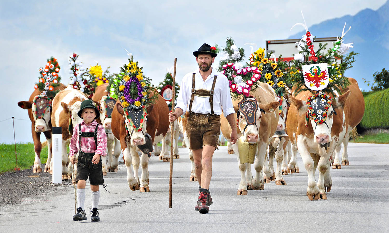 Almabtrieb festivals, when farmers herd their cattle, sheep and goats back from the mountain pastures where they have been grazing over summer, are celebrated throughout Tirol. The ‘homecoming’ celebration is a big deal, with cows decked out in elaborate headdresses, bells, and flowers for a procession celebrated by locals and tourists alike. Many villages milk Almabtrieb as an excuse for a folk festival with local food and drink, music and dances with their own local flavour.