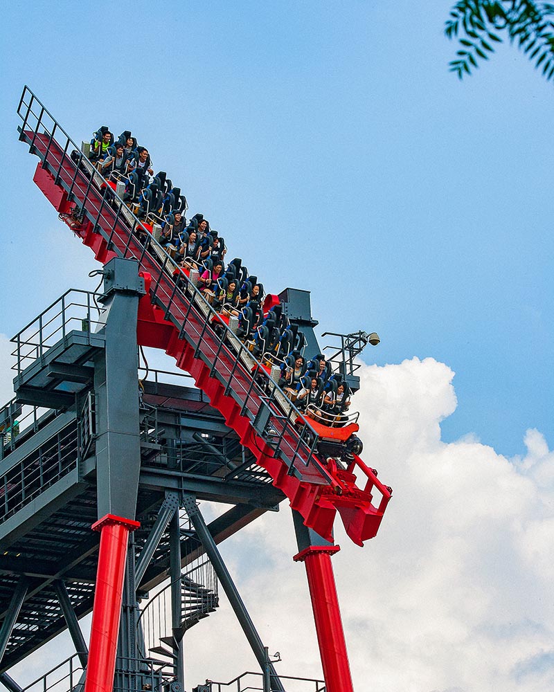 There are normal roller coasters, then there’s the X2. This mechanical beast, which you can find by following the howl of deathly screams all the way to California’s Six Flags Magic Mountain, is in a league of its own – so much so, it’s considered the very first 4D coaster. That means riders are placed in extra-wide 360-degree rotating seats that twist and flip independent of how the main train navigates the tracks. It also runs on four rails, instead of the usual two. Sound distressing? That’s not the end of it. While you’re spiralling through the air headfirst and facedown, the X2 is also accelerating to speeds of 122 kilometres an hour and climbing to an elevation of 60 metres. Oh, and your feet are dangling weightlessly in the air too, which any frequent ride-goer will know is a truly awful sensation. Chuck in a couple of inversions (corkscrew-like manoeuvres), two ultra-rare raven turns (half loops that turn into sheer drops), a backflip and the added drama of a pair of flamethrowers, and you’ve got yourself one hell of a heart-thumping ride.