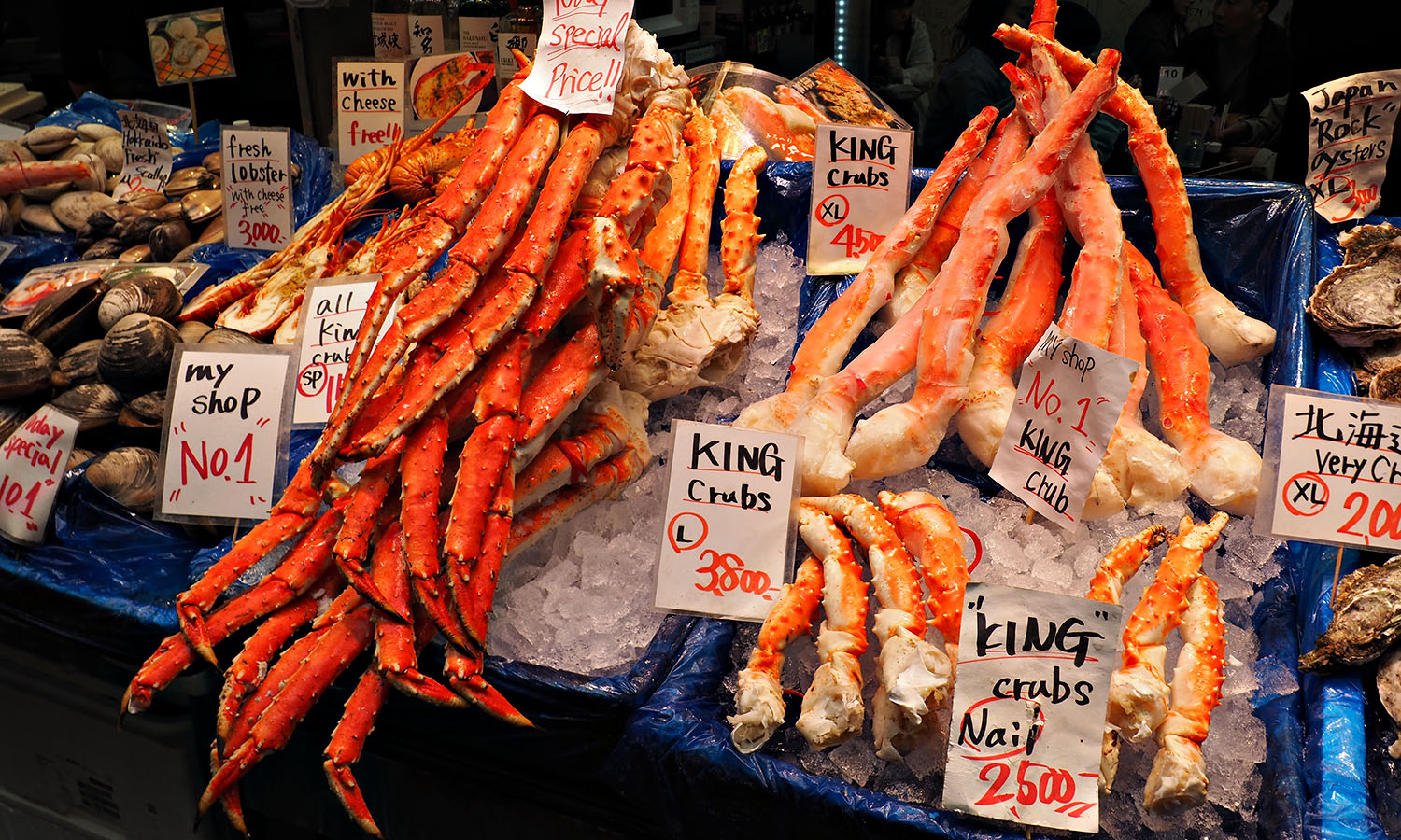 The morning wine stirs my appetite, so we head to Toretore Market, a chaotic wonderland of seafood, steam, and spectacle. It’s part market, part theatre. Giant crab legs tower over tanks of live fish, and the smell of charcoal-grilled shellfish fills the air.