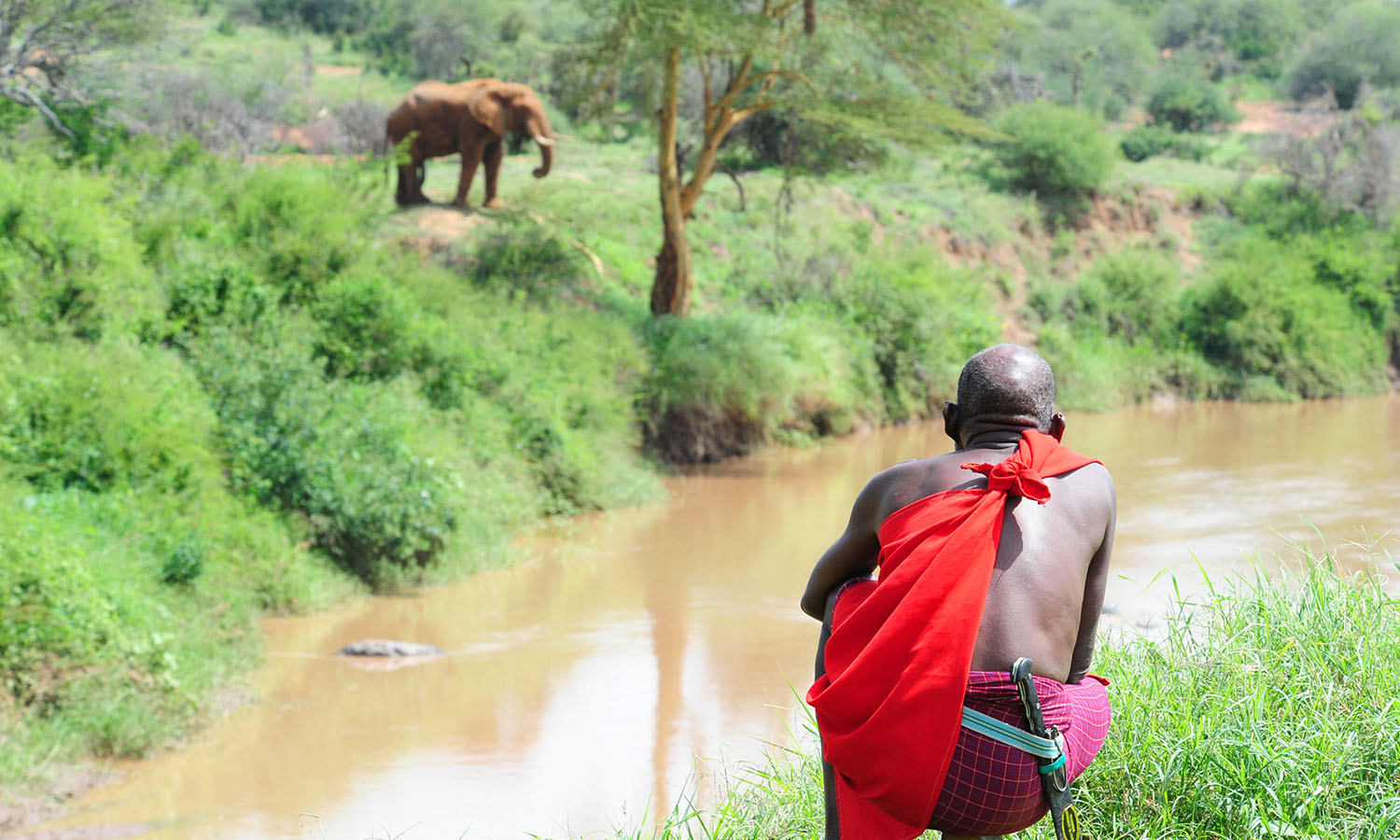 Suddenly, we happen upon three Samburu warriors by a small rock pool. Each of them is washing his clothes in the water. It’s hard to say who is more startled to see the other, but pleasantries are exchanged and we eventually continue on our way to the vantage point overlooking the Ewaso River and Laikipia landscapes.