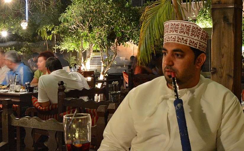 Fairy lights twist through trees and sweet smoke from the shisha coils beneath lanterns in the canopy at the sultry Kargeen Caffe. This is one of Muscat’s best-loved restaurants; inside its grounds you’ll find families feasting in dining rooms, men lounging in courtyards blowing flawless smoke rings and fashionistas with heels and handbags worth many months’ rent glimmering in hidden alcoves.
