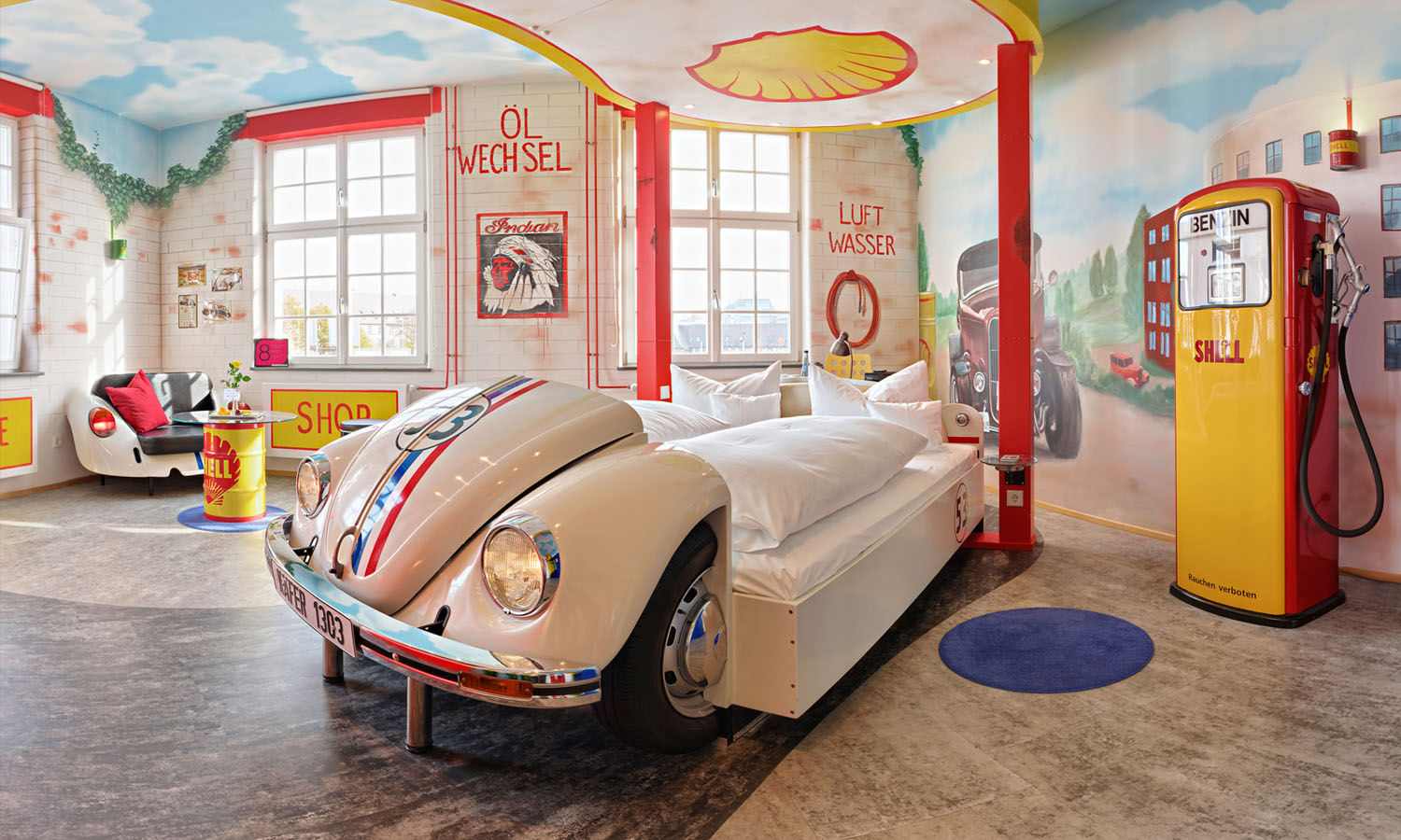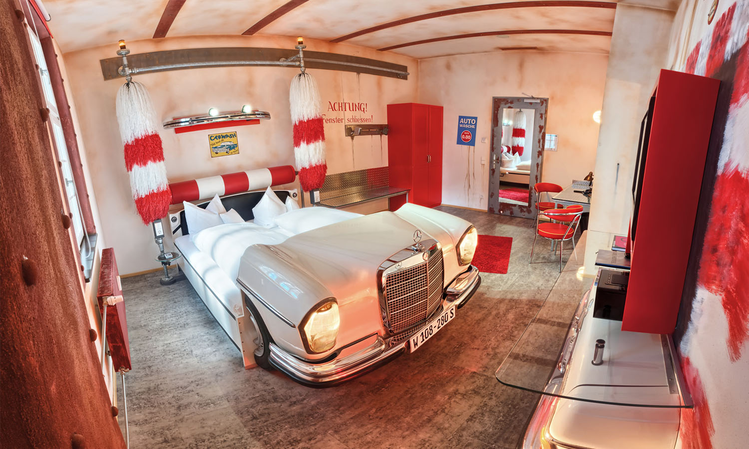 Get your motor running in one of the themed rooms at this ode to the engine, V8 Hotel. Located in the heart of Motorworld, where there’s a museum, flight simulator, indoor theme park, restaurants, a brewery and outlet shopping mall, this former airport hotel has smart suites with artwork bearing an automotive scene. It’s the beds set up between car wash brushes or kitted out like a roadside camp on Route 66, however, that really rev the beating of our hearts. Top of the line is the Mercedes Suite with a car bonnet at the end of the bed and a sundeck overlooking the countryside.