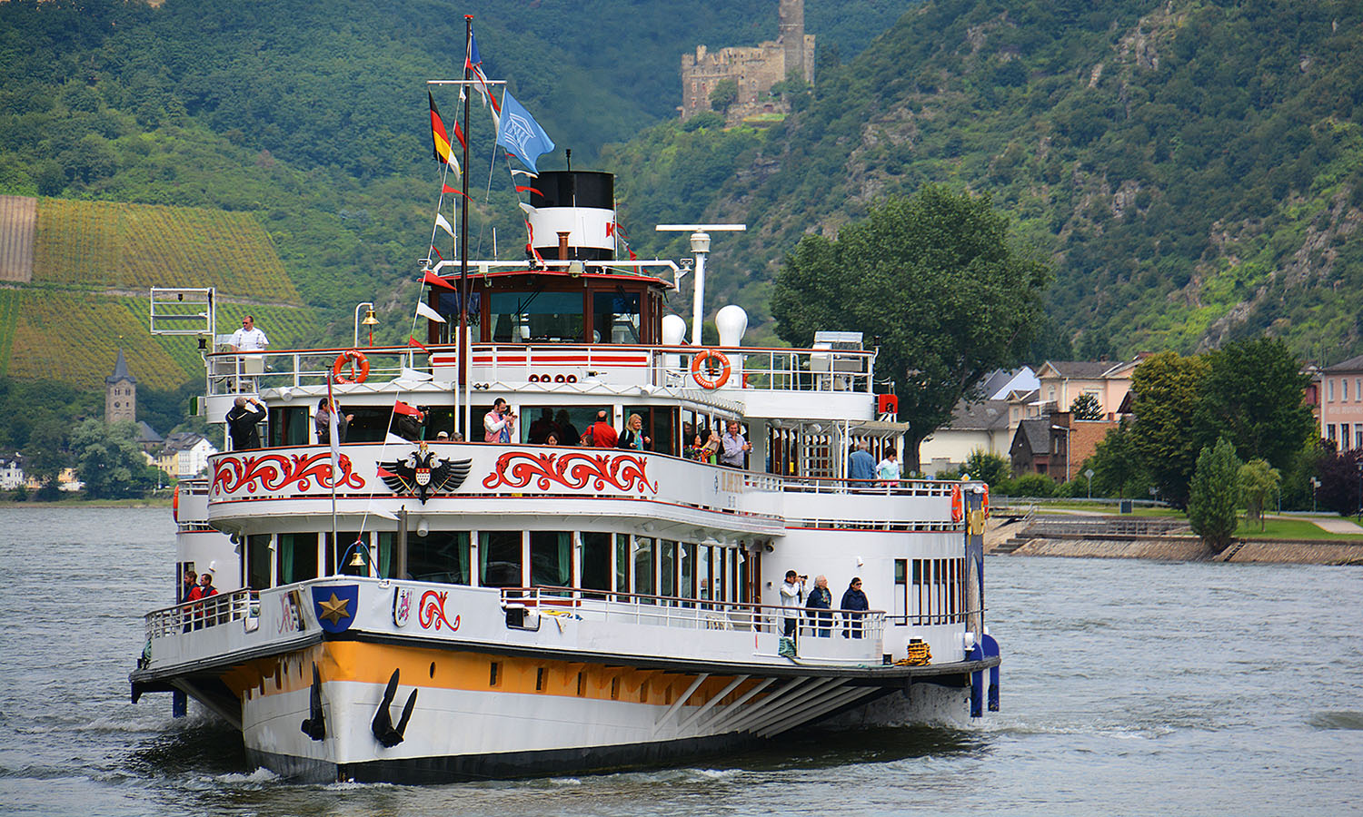 “That’s the ugly side,” announces Edgar Kirdorf, cocking his head at the west bank, which we’ve just left behind. His bed and breakfast, Hotel Deutsches Haus, in Kaub, is planted on the pretty side, danke very much. It’s a proven fact, Edgar explains, tongue firmly in cheek, because back before engines could haul ships upstream, horses did the heavy lifting while sporting blinkers that blocked the unsightly bank from view. The eye shades might have also had something to do with the glaring sun, he concedes.