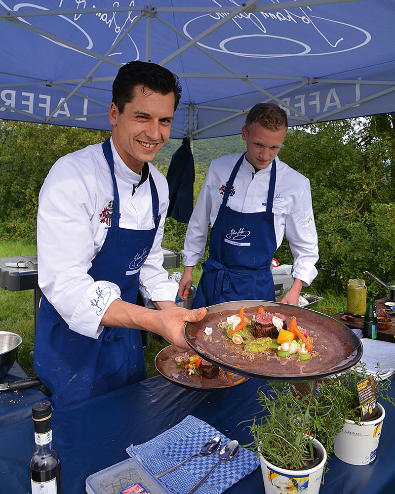 It just so happens I’ve stumbled upon one of Germany’s most famous TV chefs, the Michelin-starred Johann Lafer, who is entertaining guests on a cliff in the UNESCO World Heritage-listed Rhine Valley. A helicopter has whisked the party up here, soaring above church steeples, treetops and Lafer’s own castle, to a vantage point overlooking the medieval town of Bacharach, where they’ll quaff wine and dine into the early evening.
