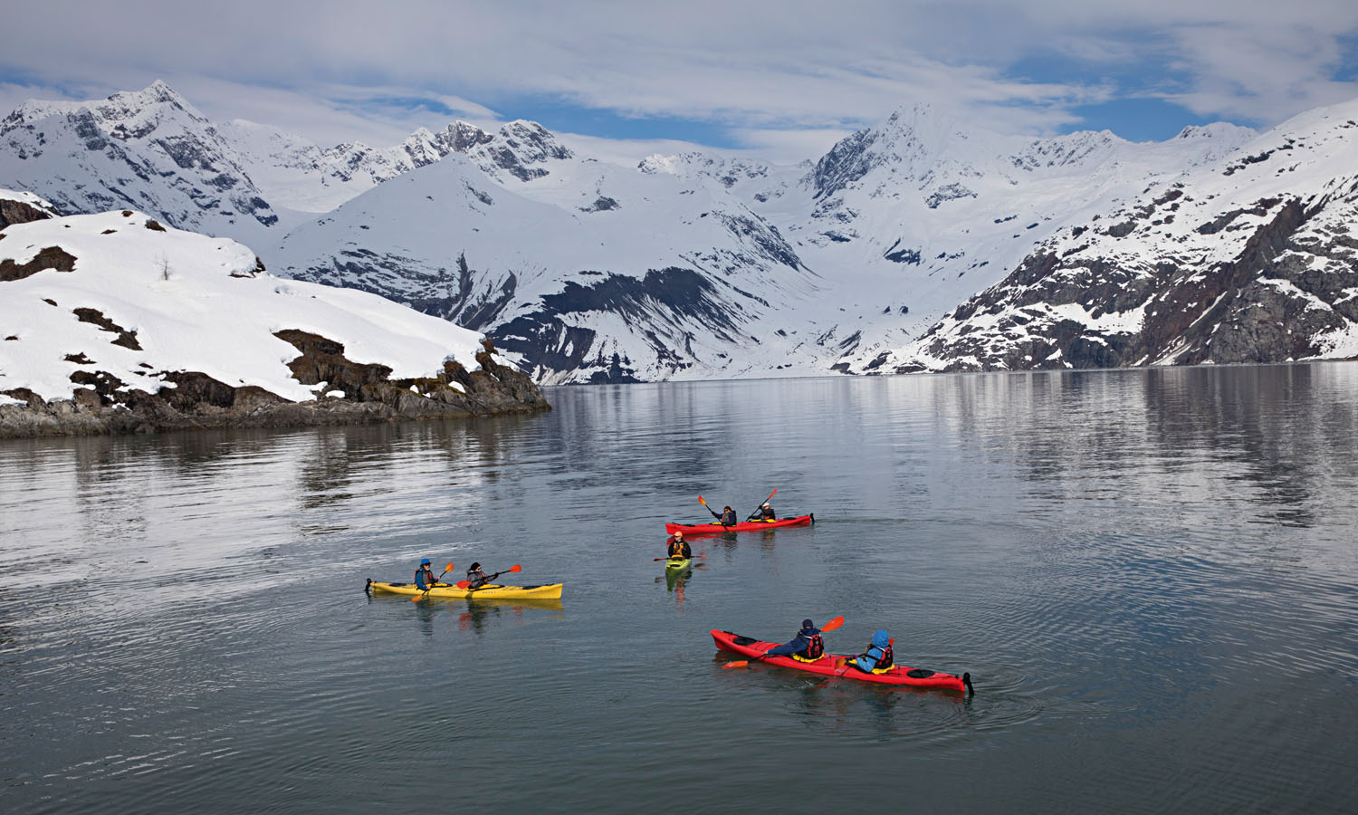 Surrounded by snow-covered mountains we paddle towards Lamplugh Glacier. It’s almost t-shirt weather. Sunlight captures the drips from my paddle and transforms them into mini starbursts. As we get closer to the glacier, whooshes of cold air sting my face and we start to navigate through the bergy bits and growlers (small chunks of ice) floating past.