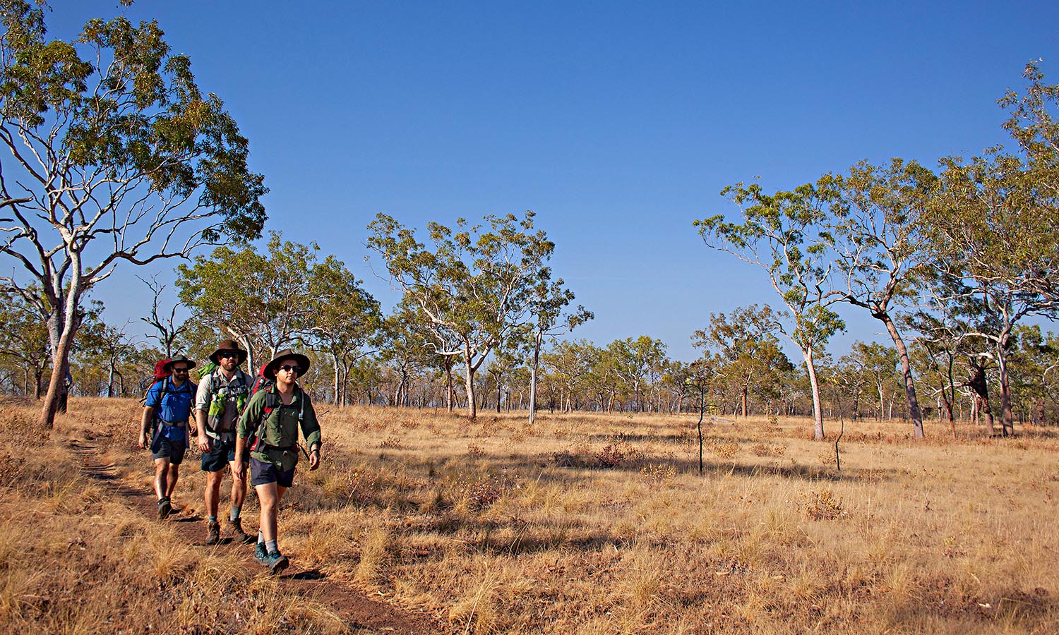 We walk past sharp clumps of sword grass that threaten to slice any exposed skin, beneath lush palms and across bone-dry riverbeds. This is the paradox of the Top End in the dry season – it’s an incredibly fertile landscape with no visible water.