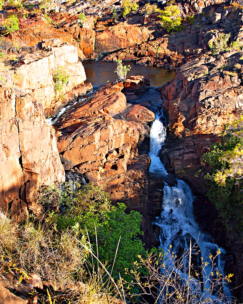 By then it’s already baking hot and the sound of running water is like music to my ears. Without hesitation I drop my pack, cast off my clothes and follow the sound to a series of small falls at Biddlecombe Cascades. Despite it being the dry season, they look anything but to me, and I gleefully jump in the top pool then scramble down over the rocks to get a strong massage at the bottom of the falls. Because we’re on top of the escarpment, there’s no need to worry about crocs – we checked, multiple times – but I still start when I hear Chris screaming my name. Rushing back to camp, I find a jagged hole torn in the top of my pack, muesli everywhere and even a few zips tugged open. I shake my fist at six red-tailed black cockatoos sitting watchfully in a nearby tree before a harsh, mournful caw behind me informs me that I’ve accused the wrong birds.