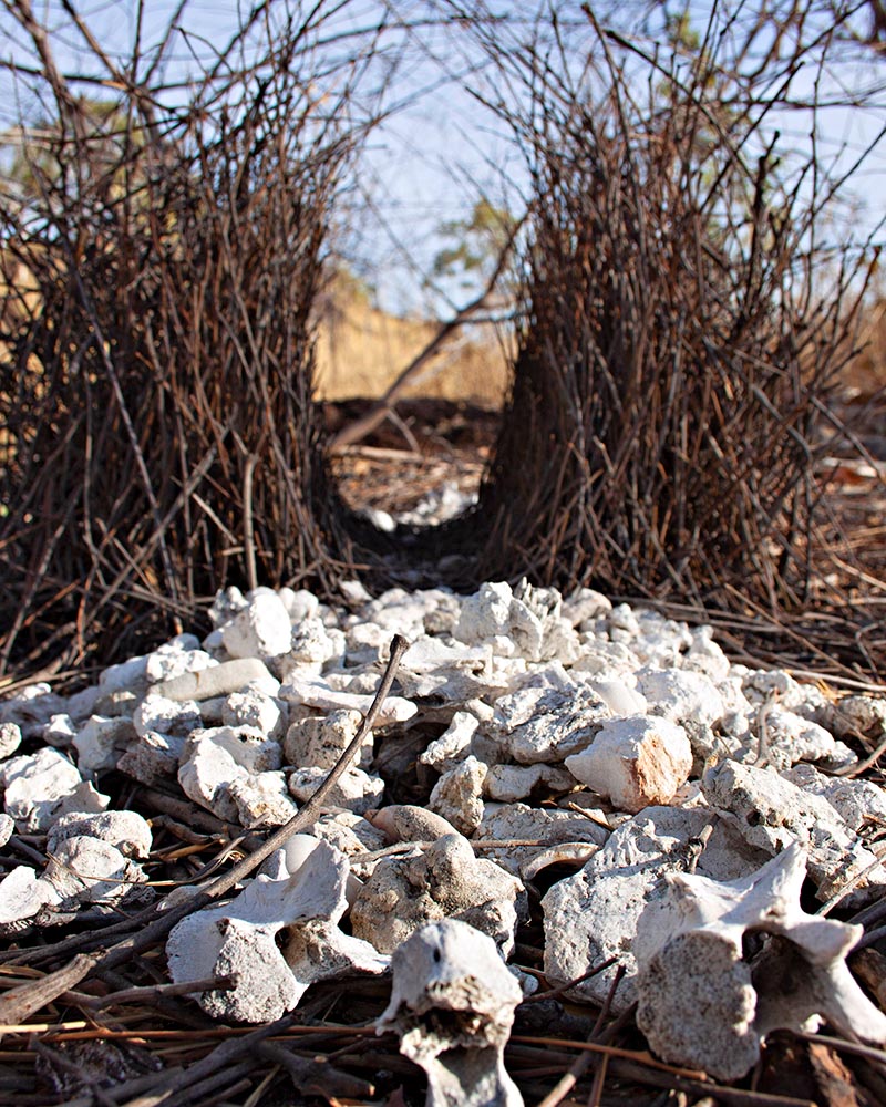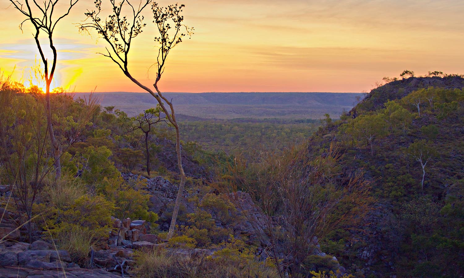 The waterholes provide much needed respite from the heat, but they’re far from the only highlights of the trail. During the days we walk through stone country, where rocks criss-crossed with fracture lines are surrounded by dry grass the colour of straw. Bloodwood trees ooze bright red sap that crystallises where it falls and sparkles in the sun like piles of garnets. We walk between termite mounds scattered like gravestones in a poorly organised cemetery – over six days they change with the colour of the soil from white to yellow and deep red before turning a tired, dusty grey. The clifftop views from the edge of the escarpment – rocky red bluffs that seem to glow in the early morning sun protecting a broad valley of dry yellow grass streaked with white gum trunks – are worth the days of walking.