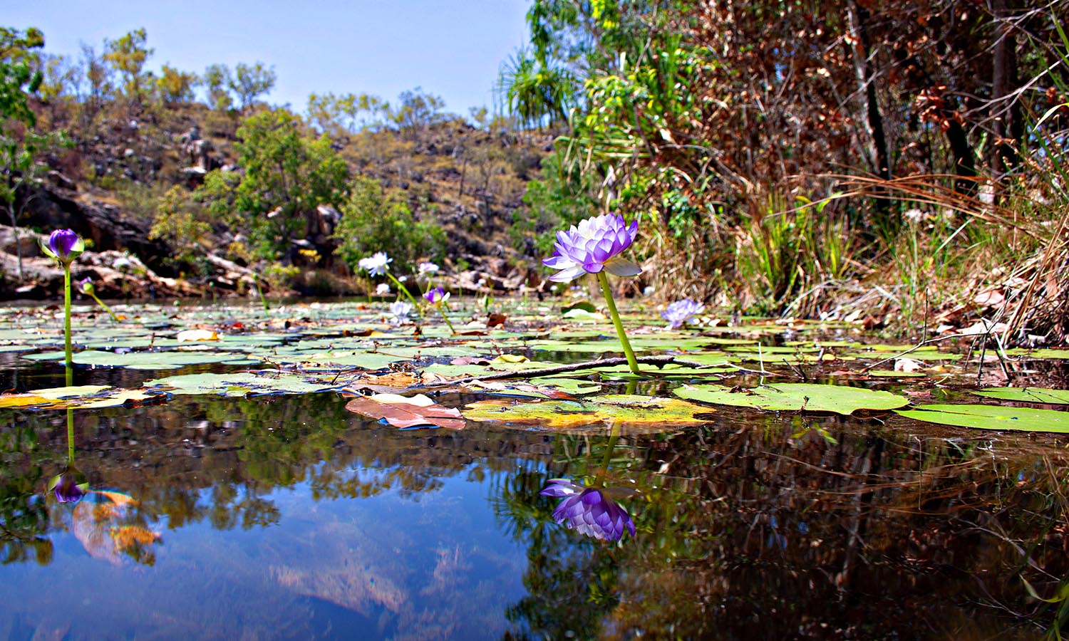 It makes us appreciate the waterholes by each campsite even more. At Sandy Camp, a giant circular pool is ringed by tall paperbarks full of birdlife and grevillea whose flowers resemble long, curling eyelashes. Scraggly blue-winged kookaburras, unrecognisable as relatives of their southern cousins, give a stifled laugh and the iridescent wings of rainbow bee-eaters catch the sun. There are even enough fish to attract cormorants, although they disperse as we gleefully dive in.