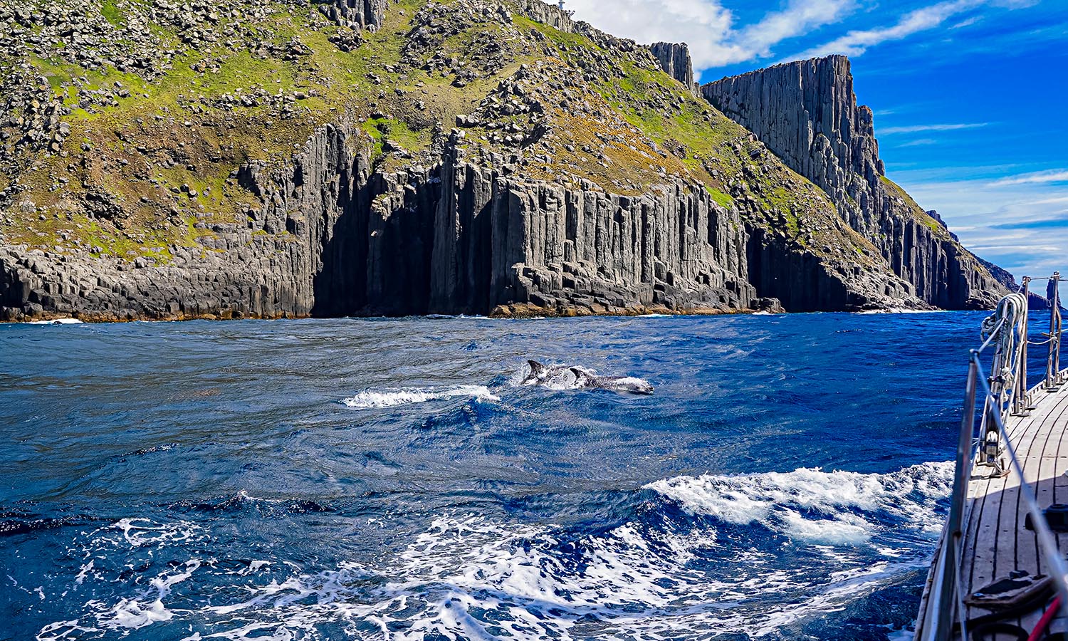 Within an instant the backs of dolphins playing off our bow are replaced with sea spray and rapid-fire wind gusts that Mark calls ‘bullets’.